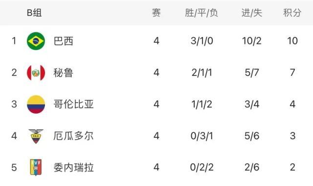 美洲杯小组赛B组5轮战罢,巴西队末轮1比1战平厄瓜多尔,4战3胜1平排名榜首;秘鲁队1比0击败委内瑞拉夺得第2,哥伦比亚和厄瓜多尔分列第3和第4位。根据赛程,接下来的8强淘汰赛,巴西队将对阵A组第4,秘鲁对A3,哥伦比亚对A2,厄瓜多尔对A1。